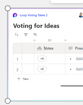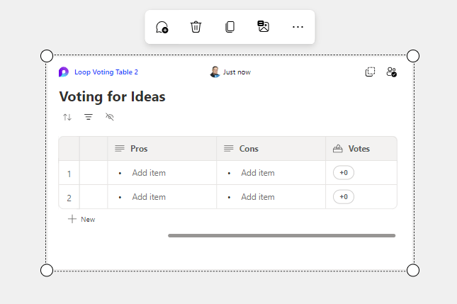 Whiteboard is lacking in voting capabilities (notes can get reactions) and the new voting feature we have been waiting for has been pushed back in the roadmap to June 2024, so Voting table Loop component is super welcome. When you add a voting table you get the default view with Idea, Pros, Cons and Votes.