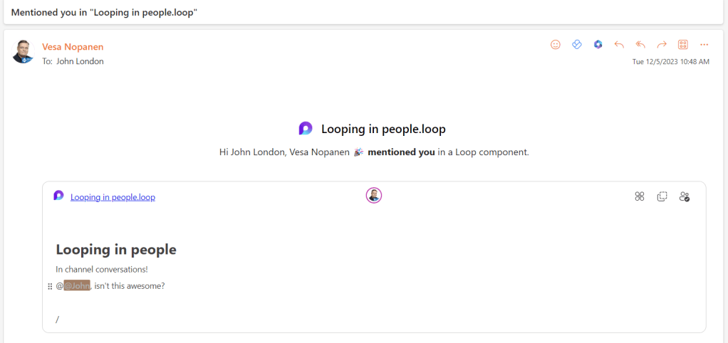 The email also lets John edit the Loop component content directly at Outlook.