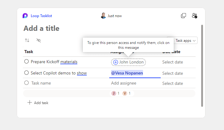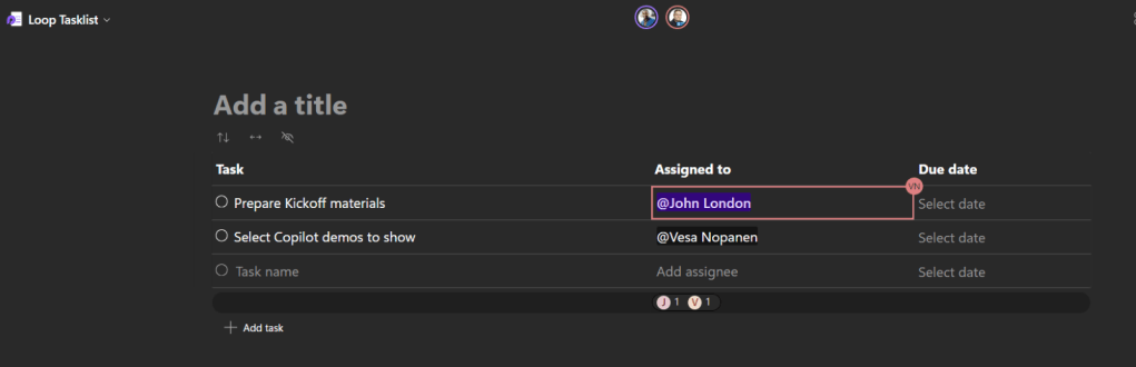 Adding tasks and people is easy. In case those persons are not already on the Whiteboard, you need to give them access to Loop component. This happens by clicking on their name in the component.