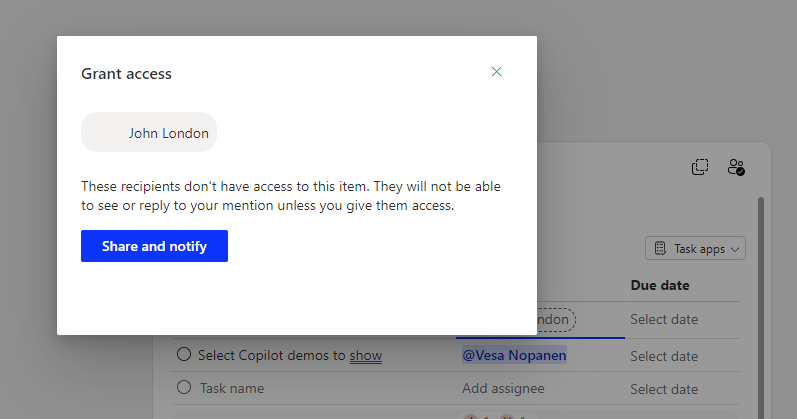 Just hit Share and notify, to enable them to collaborate with you. This does not share the Whiteboard, only the Loop component so they can see the task they have. They will get an email notifying them about the task they have been assigned to.