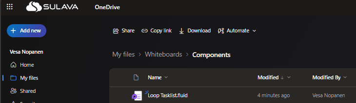 Loop components created in Whiteboard can be found in OneDrive under Whiteboards / Components folder.