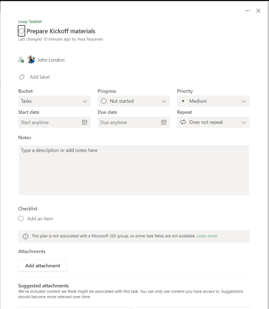 If there is a need to expand information to the task, it can be done via Planner. Yes, almost all Planner features are available. These boards are not connected to Microsoft 365 groups (or teams), so some features are missing.