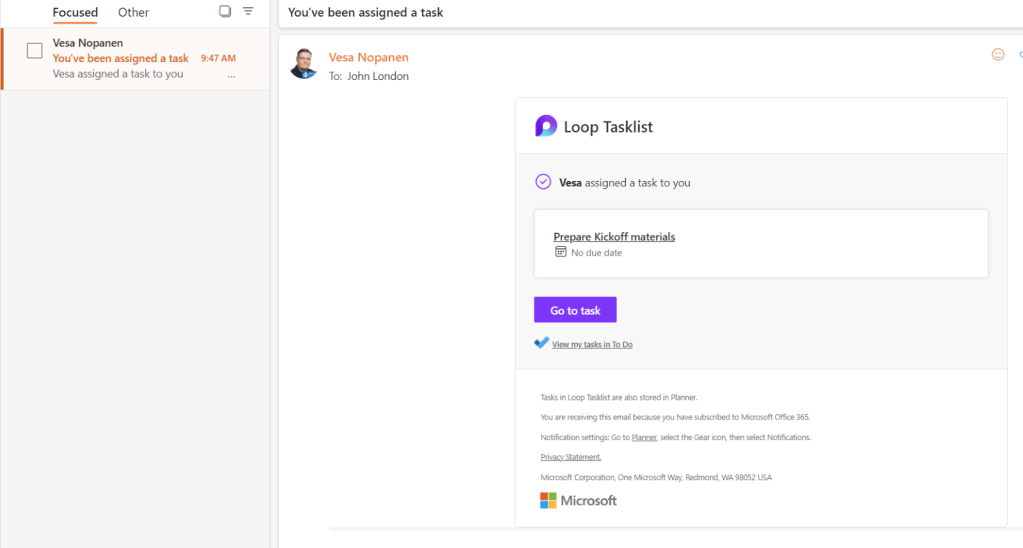 From the email user can jump directly to the Loop component (go to task) and below it can be seen “View my tasks in To Do”.