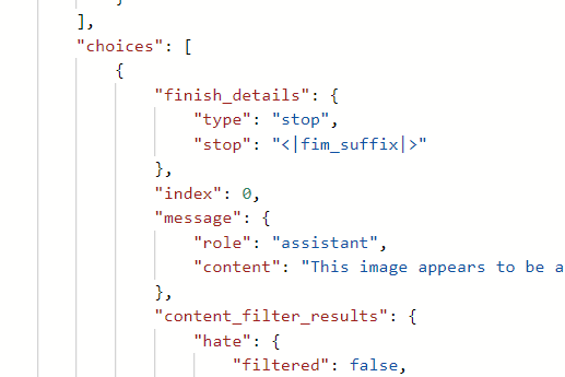 In case the image contains something that is not ok, finish_details include type “content_filter” as value. You can also get information about various levels of content from content_filter_results.