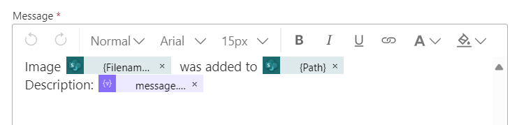 Then you can just reference the content inside the body when you take the image description and move it forward in the process. In this example, the target is a Teams channel.