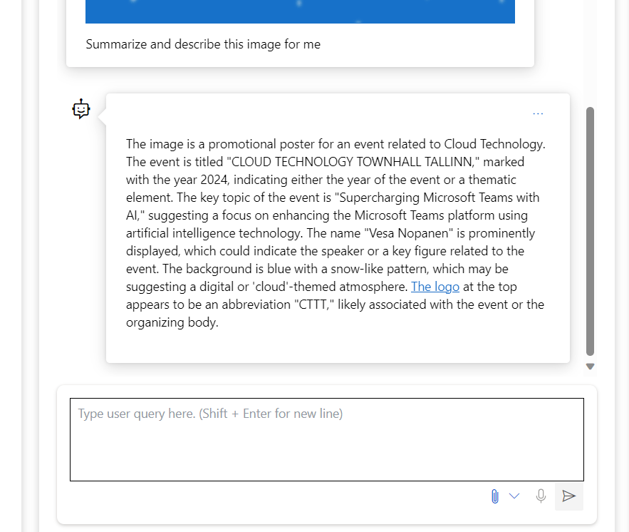 If you want to see GPT-4 Turbo with Vision in action and talk with about these possibilities live, join me at my session at Cloud Technology Townhall Tallinn 2024 on 1st of February. And no, this is not the only AI supercharging Teams example or demo I will show there live. In fact, I will also demo a second use case for image processing if time permits.