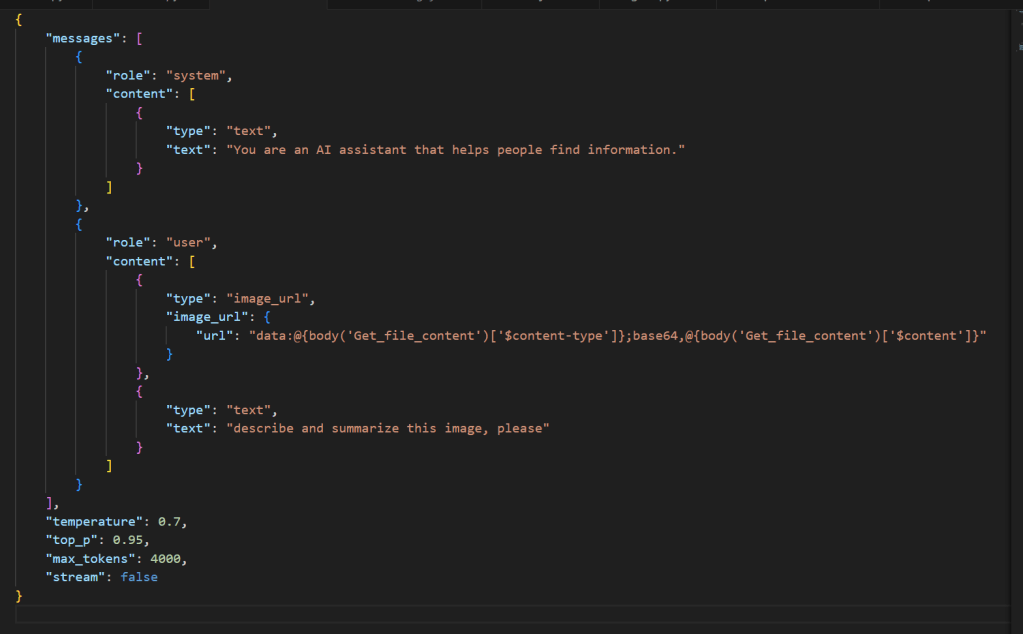 The image_url can contain a public URL to the image. It is in fact an easy way, if the image happens to be on a public website (or in Azure Blob Storage with public anonymous access). For this example, I explicitly wanted an image to be in our system. In a SharePoint library. So, we need to give more information about the file: file type and content. The image content needs to be base64 encoded.
