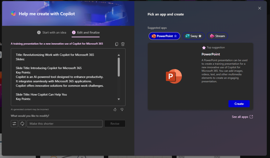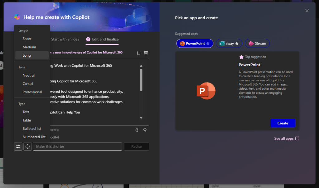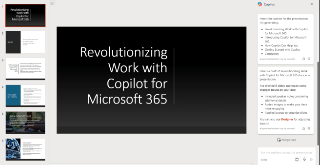 It looks to me that Help me create is in its first steps. It can create the content outline, but I haven’t been so far impressed with its ability to create captivating PowerPoint presentations. You get better results when you first use Help to create to create an outline (and ask it to make it longer), save it to Word file and then use Copilot to create a PowerPoint from that. Or the shortcut would be the create the content directly in Word.. And then you could also reference source documents when creating it. With Help me create you can’t reference to existing content.