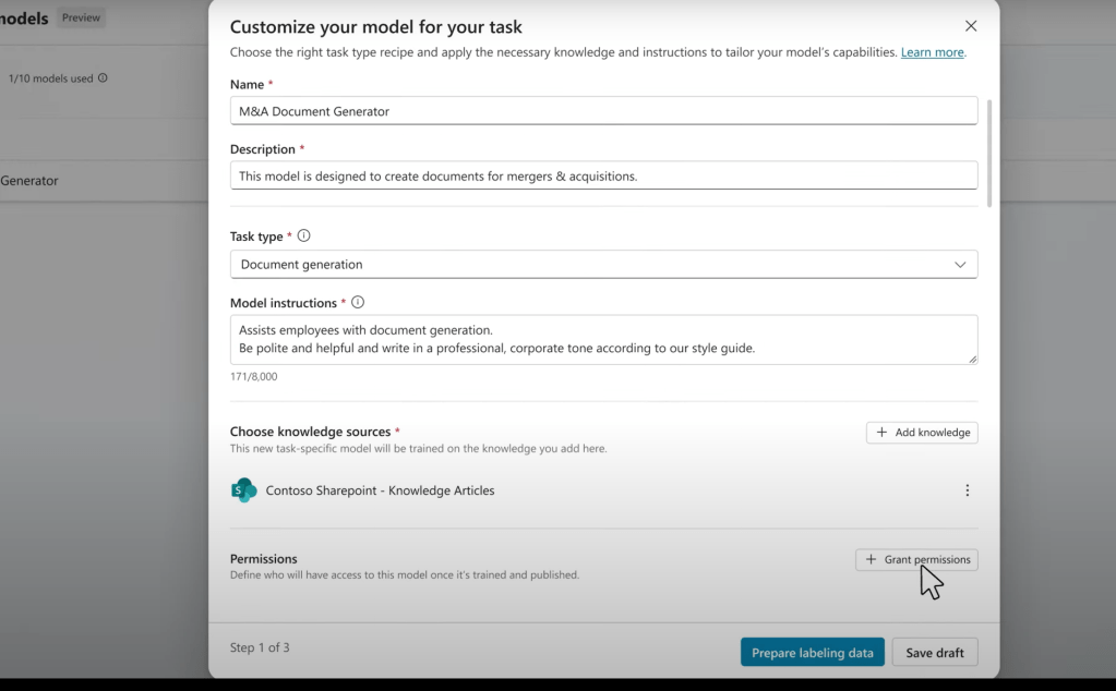 Agents built with Microsoft 365 Copilot’s Agent Builder can take advantage of these tuned models. For example, a legal firm can build an agent that generates documents for legal professionals that incorporate the style, structure and expertise of their prior work.