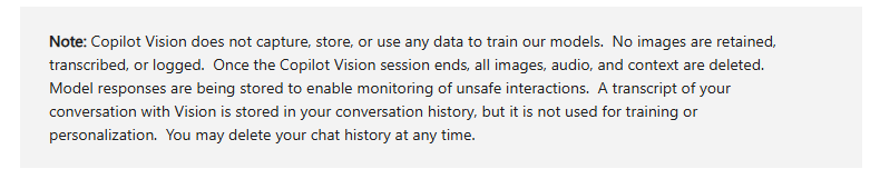 Microsoft emphasizes that Vision works under explicit user consent. You choose when to share your screen or camera feed. According to Microsoft Support, only Copilot’s responses are logged; your screen content, images, or audio are not stored and are deleted when the session ends.
