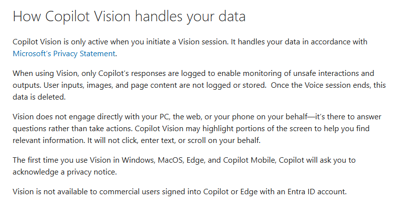 It’s important to note that Copilot Vision is part of the consumer Copilot experience, not Microsoft 365 Copilot for enterprise. This means Enterprise Data Protection (EDP) and Microsoft’s commercial compliance framework are not applied when using Vision.