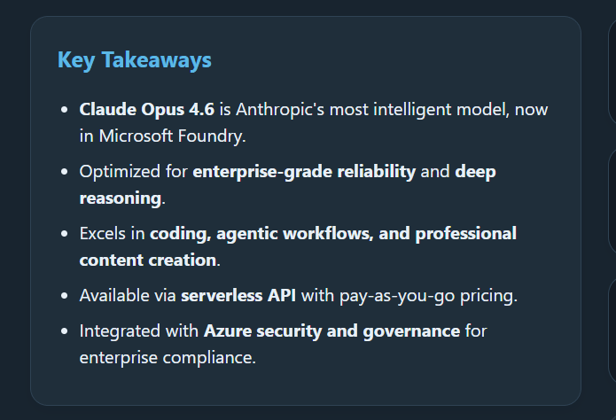 Claude Opus 4.6, Anthropic’s most intelligent model to date, is now available in Microsoft Foundry. This is superb news, this it opens up new possibilities for production-grade AI agents and enterprise workflows that demand both frontier intelligence and enterprise-grade governance.