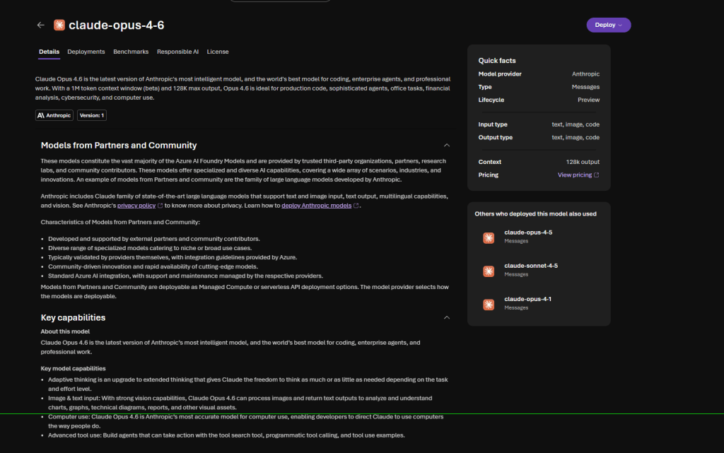 Claude Opus 4.6 is available through serverless API or managed compute deployment options in Microsoft Foundry. The serverless API is particularly attractive for most enterprise scenarios with pay-as-you-go billing—you’re only charged for what you use.