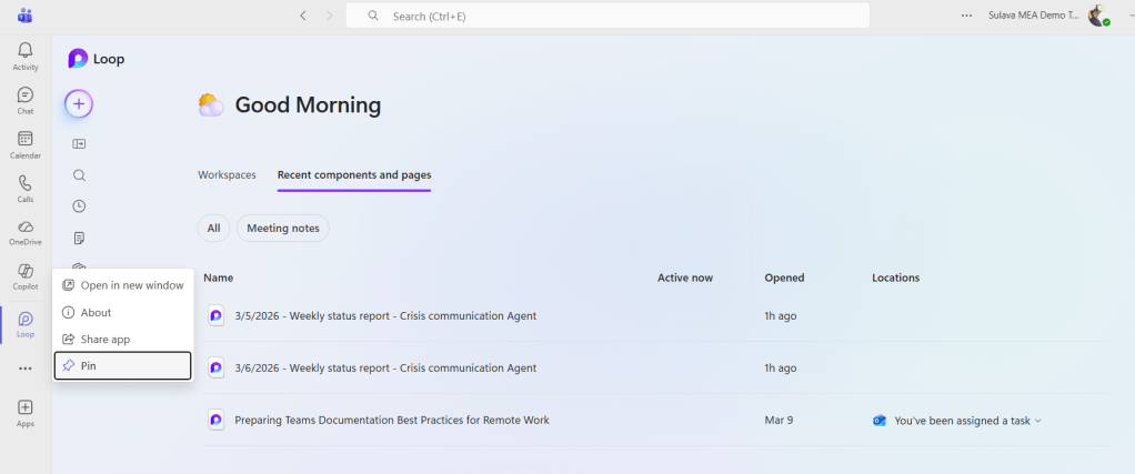 We are not going to stop there. Since we have the Loop application open in Teams, we should pin it to the left navigation with the right click on top of left navigation Loop icon.