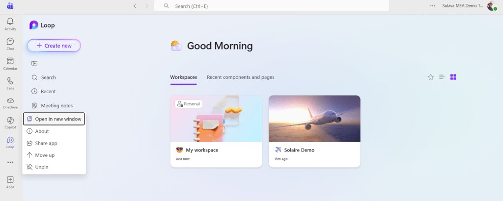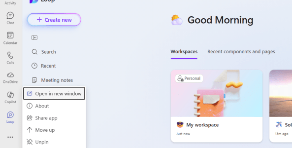 This open in new window doesn’t apply just to Loop app – you can do that to many applications and Teams content. You can “pop-out” a channel, group or meeting conversation(chat), meeting share, or even Teams Activity, Chats, Calendar etc.