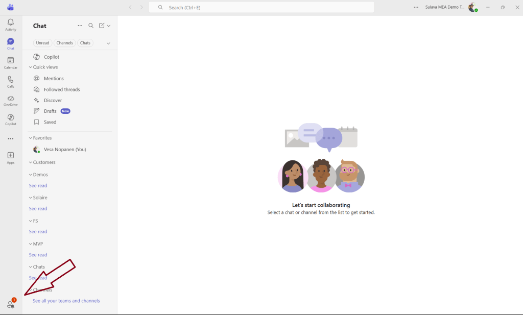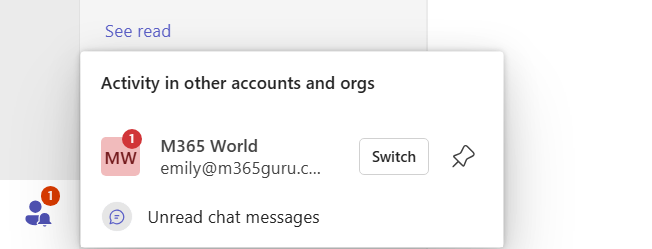 The new way makes it open to notification activities quickly – just clicking on the Unread chat messages takes me to those right away: the correct chat group opens directly into a new window, so my Teams desktop is not switching a tenant.