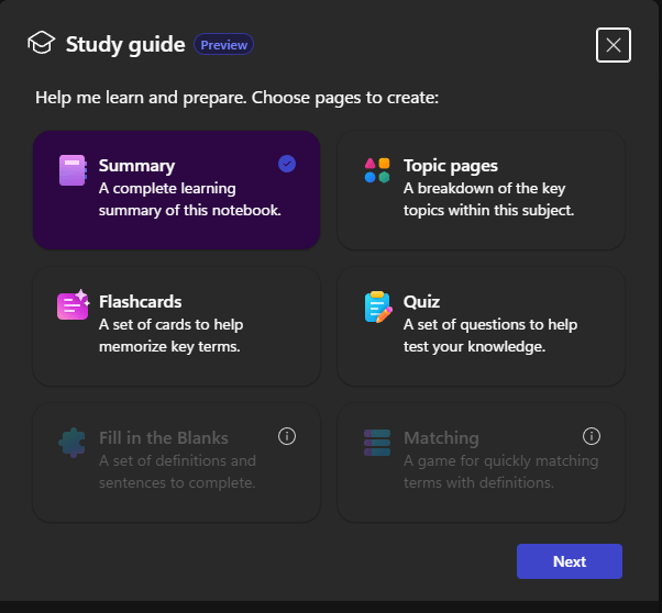 The Study Guide feature transforms Copilot Notebooks into a learning platform. Add your training materials, product documentation, or onboarding content, and Copilot generates quizzes, flashcards, and topic summaries automatically. This isn’t just for students—it’s for any team ramping up on complex information quickly.