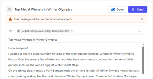 In tenants where it’s enabled, when Copilot detects email-writing intent it can open an embedded Outlook compose experience inside Copilot Chat. You can review and edit the content, modify recipients, and send—or open the draft in Outlook to continue there.