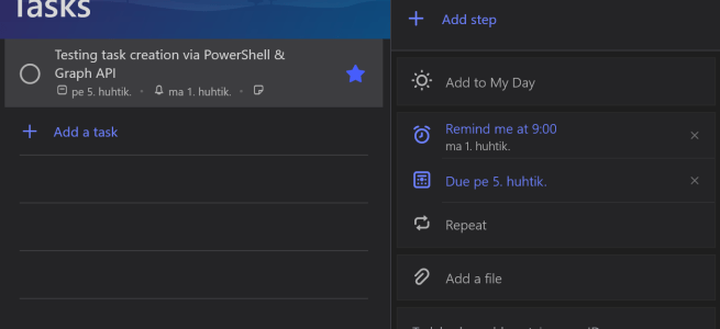 ToDo Graph API has appeared the in documentation Graph API at Docs.Microsoft.Com . This opens up new possibilities to aggregate user tasks into a single app - ToDo. I did some testing with the API to see what is possible - and what is not. Getting tasks How to retrieve your tasks using Graph Explorer, … Continue reading ToDo like a boss – automate task creation using Graph API (preview)